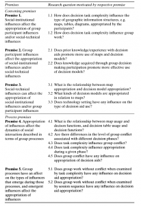 از مقدمات EAST2 (همانطور که در جدول 7.1 فهرست شده است) برای ایجاد انگیزه در سؤالات تحقیقاتی استفاده کنید تا مطالعة ما را در مورد تصمیمگیری مشترک دربارة سایتهای توسعة مجدد زیستگاه متمرکز کند. از آنجایی که ما به پویایی تعامل انسان- رایانه- انسان در طول تصمیمگیری مشترک که از ابزارهای پشتیبانی تصمیم استفاده میکند علاقهمندیم، به ادبیات تحقیق توجه کردیم تا بهجای «نتایج» روی «فرایند» تمرکز کنیم (Rohrbaugh 1989, Todd 1995). مطالعات فرایندی نسبت به مطالعات نتیجه در مطالعات دقیق رفتار با استفاده از طرحهای آزمایش آزمایشگاهی معنادارتر هستند؛ زیرا روابط اجتماعی- رفتاری «زمینة واقعی» را از دست میدهند؛ بنابراین، تنها به پنج مقدمة اول پرداخته میشود؛ زیرا فرضیههای 6 و 7 بر نتایج تمرکز دارند. ما مجموعهای از سؤالات پژوهشی را فهرست میکنیم که به دلیل علاقهمان، سؤالات بیشتری برای برخی مقدمات نسبت به دیگران دربرمیگیرد.