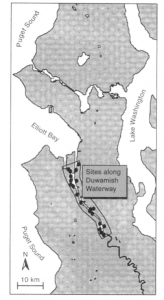 شکل 7.1 شهر سیاتل و مکانهای بازسازی زیستگاه در امتداد آبراه Duwamish