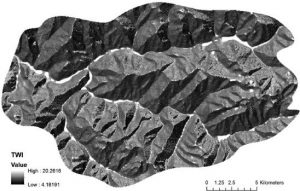 TWI تأثیر توپوگرافی را بر موقعیت و اندازه نواحی تجمع آب در خاک ها تعیین می کند ( بیون و کرکبای، 1979). به صورت زیر تعریف شده است :