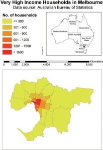 بطور مرسوم نقشه های چند متغیره با ترکیب و نمایش چندین لایه نقشه با انواع مختلف نمادها، مقایسه چند ویژگی با استفاده از نمودارها، یا نمایش چند ویژگی با استفاده از متغیرهای بصری ساخته می شوند. مثلا شکل 8-4 نشان می دهد که چگونه توزیع جمعیت با سیستم رودخانه در منطقه کوهستانی با پوشاندن لایه جمعیت نشان داده شده توسط نقاط و لایه جریان نشان داده شده با استفاده از نمادهای خط مرتبط است. شکل 8-19 ذخایر برآوردی مس در سطح زمین در مناطق بزرگتر سیدنی در استرالیا را نشان می دهد. الگوهای نمادهای خط نشان دهنده مقدار کل برآورد شده از سهام مس در سطح زمین در حال استفاده در هر منطقه است. نمودارهای ستونی به ترتیب نشان دهنده موجودی مس موجود در مسکن خصوصی، وسایل نقلیه موتوری خصوصی، محصولات مصرفی و زیرساخت های مخابراتی و توزیع برق است.