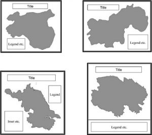 طرح نقشه مجموعه ای از عناصر نقشه کشی است که در یک صفحه چیده شده و سازماندهی شده اند. طراحی چیدمان شامل گردهم آوردن عناصر متفاوت مانند موارد نشان داده شده در آن است. شکل 8-1 به چیدمان بصری موثر، زیباشناختی، منسجم و متعادل پرداخته است. به عنوان اصل کلی بدنه نقشه باید در مرکز بصری و سایر عناصر به طور هماهنگ در اطراف بدنه نقشه چیده شود. مرکز بصری نقشه کمی بالاتر از مرکز واقعی صفحه است. از آنجا که مرکز بینایی ناحیه ای است که چشم به طور طبیعی تمایل دارد به تنهایی فرود بیاید، مهمترین عناصر نقشه نگاری باید در آن ناحیه قرار گیرد. شکل 8-17 نقشه با طراحی ضعیف را نشان می دهد که در آن نوار مقیاس به طور نامناسب در ناحیه مرکز بصری قرار گرفته است.