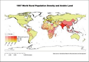 شکل 8-20 نقشه choropleth دو متغیره از تراکم جمعیت روستایی جهان در سال 1997 و زمین های زراعی