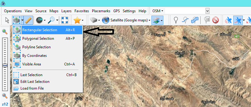 توصیه می شود اگر می خواهید تصاویر شما به صورت منظم و چهار گوش باشد از گزینه Rectangular selection استفاده کنید و مرز محدوده ای که قصد دانلود تصاویر یا نقشه های آن را دارید مشخص کنید.