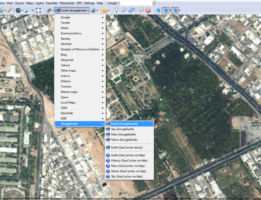 سپس از قسمت select bace map گزینه google earth را انتخاب می نمایید . مشاهده میکنید که تصویر ذخیره شده در کش نرم افزار گوگل ارث در نرم افزار sas.planet نمایش داده شده است و شما می توانید آن را دانلود کنید و با تصویر google satellite بروز شده مقایسه نمایید.