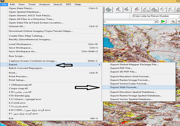 همانطور که می دانید تصاویر نرم افزار SAS.planet داری فرمت Mbtile می باشند و در قدم اول بایستی فایل های رستری ما تبدیل به فرمت Mbtile شوند. برای این کار طبق مراحل ذیل از نرم افزار global mapper استفاده کنیم: