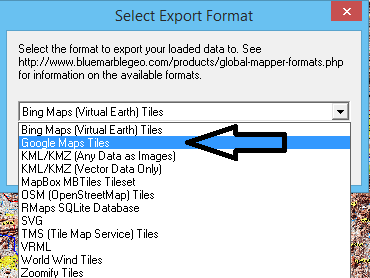 در پنجره select export format گزینه googlemap tiles را انتخاب می کنید.