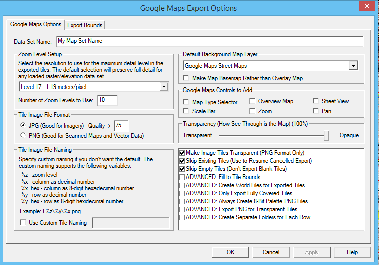 پنجره google maps export options باز می شود. پس از مشخص کردن نام و انتخاب مسیر ذخیره در قسمت zoomlevel سطح بزرگنمایی نقشه و تعداد طبقات آن را مشخص می کنید و فرمت تصاویر را jpeg قرار می دهید و در نهایت ok کنید.