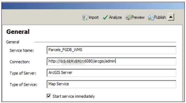 روی اتصال دو بار کلیک کنید. لیست سرویس‌هایی که ایجاد کرده اید، ظاهر می‌شود. روی یکی از آن‌ها کلیک کنید و سربرگ Preview را انتخاب کنید تا محتویات سرویس را ببینید. این آسان ترین راه دیدن سرویس‌هایی است که کار می‌کنند. می‌خواهیم این سرویس‌ها را در ArcMap بررسی کنیم. پس باید یک layer file ایجاد کنیم. از ArcCatalog روی سرویس Parcles_FGDB راست کلیک کنید و Create Layer را انتخاب کنید. layer file را در مسیر C:\AGSA\Layers و با نام Parcels_FGDB.lyr ذخیره کنید. بدین ترتیب یک layer file با پارامترهای ضروری ایجاد می‌شود. Parcels_FGDB.lyr این سرویس را از هر ArcGIS forDesktop موجود در یک شبکه‌ی محلی استفاده می‌کند.