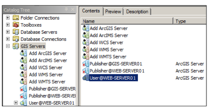 ArcCatalog را بازکنید. از درخت Catalog، گره GIS Servers را بازکنید. روی Add ArcGIS Server دو بار کلیک کنید. گزینه‌ی Use GIS services را انتخاب کنید. روی Next کلیک کنید. در فیلد Server URL آدرس URL سایت سرور را وارد کنید. اگر یک وب سرور اختصاصی نصب‌کرده‌اید، بهتر است که از آن استفاده کنید. اگر وب سرور ندارید، می‌توانید یکی از وب سرورهای توکاری که در هر کدام از GIS سرورهای قراردارد، استفاده کنید. در اینجا لینک این وب سرور توکار https://GIS-SERVER01:6080/arcgis است. در اینجا از وب سرور با آدرس https://WEB-SERVER01/wa/ استفاده خواهیم کرد. در مرحله‌ی بعد کادرهای Authentication را خالی رها کنید. روی finish کلیک کنید. در تصویر زیر می‌بینید که اتصال ایجاد شده است. نام اتصال را به User@WEB-SERVER01 یا User@GIS-SERVER01 بستگی به سروری که به آن متصل شده اید، تغییر دهید.