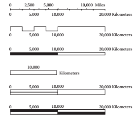 3-میله گرافیکی: شاید معمول ترین و مفیدترین شکل بیان مقیاس نقشه، استفاده از میله گرافیکی یا سایر شکلهای بصری (شکل 2-1) باشد. این میلهها به خواننده نقشه اجازه میدهد تا بصورت بصری فواصل نمایش داده شده بر روی میله گرافیکی را بررسی کرده و به سرعت این فواصل را با فواصل نقشه برای تعیین فاصله زمینی (واقعی) مقایسه کند. در نتیجه دیگر نیازی به محاسبات ریاضی نیست. جنبه مهم دیگر مقیاسهای میله گرافیکی قابلیت تنظیم آنها برا اساس تغییرات نقشه است. برای مثال، اگر اندازه یک نقشه کاغذی 11 اینچ (30 سانتی متر) در 17 اینچ(43 سانتی متر) کاهش باید، مقیاس میله گرافیکی نیز به همین نسبت کوچکتر خواهد شد. از این مقیاس میلهای همچنای میتوان برای محاسبه فاصله زمینی (واقعی) استفاده کرد. در حالیکه چنین ویژگی برای کسر معرف و مقیای شفاهی وجود ندارد زیرا تغییرات فیزیکی در نقشه باعث تغییر نسبتها در این نوع نقشهها خواهدشد. در نقشههای رقومی، با تغییر سطح بزرگنمایی نقشه، میلههای مقیاس گرافیکی نیز تغییر خواهد کرد(شکلهای 2-2).