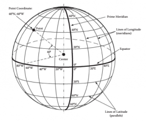 مختصات عرض و طول جغرافی که به نام مختصات کروی نیز شناخته میشود از اندازههای زاویه(درجه) از مرکز زمین برای عرض جغرافیایی و از نصف النهار (یا صفر درجه) برای طول جغرافیایی استفاده میکند. شکل 2. 7 بصورت گرافیکی مختصات طول و عرض جغرافیایی را نشان میدهد.