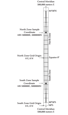 شکل 2-10: تک پهنه UTM، این شکل بخشهای شمال و جنوب این پهنه را نشان میدهد که بر خط استوا تقسیم شده است. شبکه دکارتی(x,g) پهنه شمال از سمت چپ و پایین این پهنه در خط استوا(عرض جغرافیایی 0 درجه) شروع میشود و شبکه دکارتیx,g)) پهنه جنوب از سمت پایین وچپ این پهنه در 90 درجه جنب شروع میشود. سپس ازنقاط مبدا متناظر درهر پهنه، مختصات برحسب متر در امتدادتصویرسازی این پهنه در فضای اعداد مثبت (شکل2. 8) اندازه گیری میشوند(با واحدههایی که به northing یا اندازه گیریهای شمال به جنوب و easting یا اندازه گیریهای شرق به غرب مشهور هستند). نصف النهار مرکزی هر پهنه UTM به نام false easting شناخته میشودو مقدار 500000 متر برای آن در نظر گرفته میشود. در نهایت به دو مختصاتUTM نمونه در شکل 2. 10 دقت کنیدکه تقریبا به ترتیب در مرکز شمال و جنوب قرار دارند. این مختصات نومنه چگونگی نوشان جفت مختصات UTM برحسب 1-عدد پهنه 2-نیمکره شمالی یا جنوبی 3–ارزش و مقدار و 4- مقدار (N northing 7) رقمی را نشان میدهد. برای مثال، مختصات نومنه پهنه شمال 18N 500000E, 5000000N است.