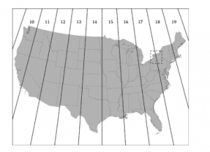 شکل 2-11: پهنههای UTM در ایالات متحده آمریکا. بسیاری از پهنهها، ایالتها را به دو یا چند بخش بیشتر تقسیم میکند. برای مثال، به کادر نقطه چین شده در سمت بالا و راست شکل دقت کنید که ناحیه بین پهنههای 17 و 18 را نشان میدهد و از میان ایالت نیویورک میگذرد. در این مورد، تصویرسازی نقشه خاص که پهنه 18 UTM نامیده میشود به گونهای توسعه یافته است که مختصات پهنه 18 UTM را میتوان برای کل ایالت نیویورک استفاده کرد(تهیه نقشه توسط برایان توماسزوسکی).