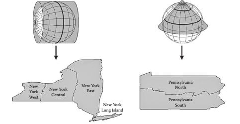 شکل 2-13: مثالهای پهنههای مختصات مسطح ایالتی و سطوح تصویرسازی مورد استفاده برای تعریف این پهنه ها. در سمت چپ این شکل، پهنههای مختصات مسطح ایالتی برای نیویورک نشان داده شده است. این پهنهها بر اساس تصویرسازی استوانهای متقاطع است زیرا جهت آنها از شمال به جنوب است. شمت راست این شکل پهنههای مختصات مسطح پنسلوانیا نشان داده شده است. این پهنهها براساس سطح تصویرسازی استوانهای است زیرا جهت آنها از شرق به غرب است. در انتخاب سطح تصویرسازی خاص باید کاهش تغییرات ناشی زا تصویرسازی مدنظر قرار گیرد(تهیه نقشه توسط برایان توماسزوسکی).