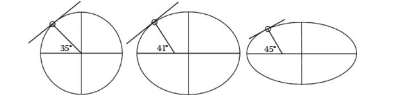شکل2-14: مثالهای بیضی شکل مرجع و اهمیت آنها در دستگاه مختصات. نقطه فرضی (دایره کوچک در شکل بالا) واقع بر روی سطح بر مبنای شکل بیضی مرجع مورد استفاده برای اندازه گیری دارای مقادیر متفاوت عرض جغرافیایی است(35 درجه، 41 درجه و 45 درجه).