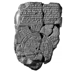 شکل 2-17: Imago Mundi یکی از قدیمی ترین نقشههای بجامانده از عصر بابلیان است. به خط میخی بر بالای این اثر وتوصیف کلی بابل و چند جزیره و سرزمینهای اطراف آن دقت کنید.