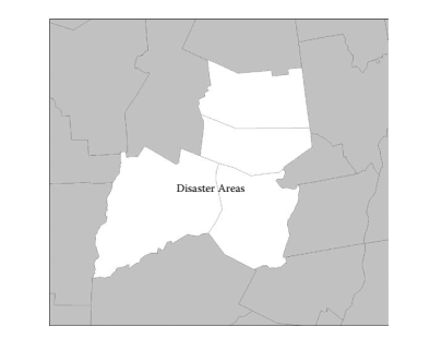شکل 2-20b نیز مثالی از روابط موضوع اصلی-زمینه را برای یک نقشه منطقه بلایای فرضی را نشان میدهد اما در این مورد از رنگهای روشنتر برای مشخص کردن شکل مناطق آسیب دیده از بلایا و رنگهای تیرهتر برای مشخص کردن زمینه یا مناطق اطراف منطقه آسیب دیده از بلایا استفاده میشود. هردو روش تعیین روابط موضوع اصلی -زمینه معتبر و موثر است و این طراح نقشه است که تعیین میکند کدام روش بهترین روش است و خواننده نقشه میتواند نقشه را به بهترین نحو قرائت کند.