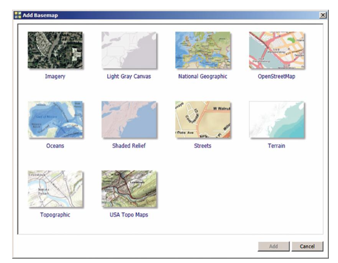 شکل 2-23: گزینههای نقشه پایه در نرم افزار GIS ArcMap دسکتاپ متعلق به Esri. انواع مختلفی از نقشه های پایه باتوجه به نیازهای تهیه نقشه وجود دارد.