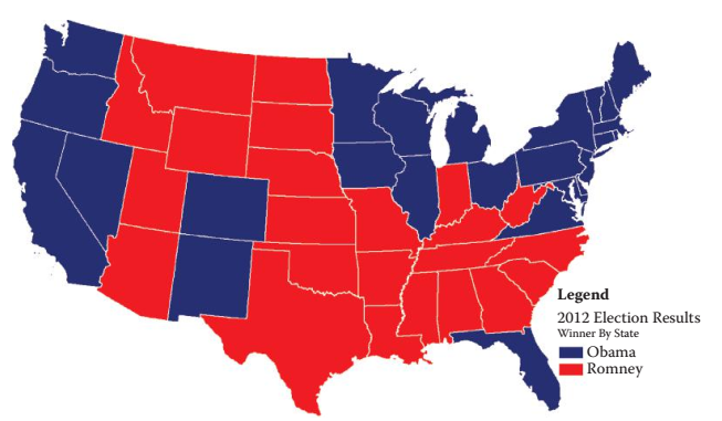 شکل 2-24: مثالی از نقشه موضوعی: نتایج اتتخابات 2012 آمریکا بر حسب ایالت. در این نقشه، چندین الگوی منطقهای را میتوان مشاهده کرد. برای مثال، به خوشه ایالتهای قرمز در بخش جنوب شرقی آمریکا توجه کرد که به میت رامنی رای دادند. همچنین به خوشه ایالتهای آبی در شمال شرقی آمریکا توجه کنید که به باراک اوباما رای دادند. الگوهایی ماننداین موارد میتواند نشان دهنده ویژگیهای افرادی باشد که در این مناطق (مانند ارزشهای مذهبی یا اجتماعی) زندگی میکنند. این شکل مثالی از تهیه نقشه دادههای اسمی یا کیفی است که برای اینکار از غلظتهای مختلف رنگ استفاده میشود. برای مثال؛ ایالتهای آمریکا به ایالتهای رای دهنده به اوباما یا رامنی تقسیم میشوند. اگرچه این عناوین براساس تعداد رایها در هر ایالت بدست آمده است بین ایالتها از نظر رای دادن به اوبام یا رامنی تفاوت معناداری وجود ندارد (تهیه نقشه توسط برایان توماسزوسکی).