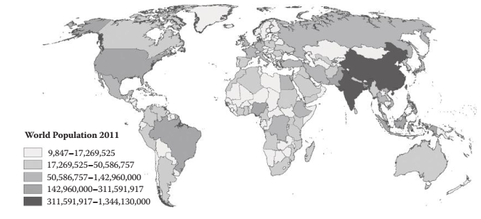 شکل 2. 25: مثالی از نقشه موضوعی کوروپلت: تعداد آمار خام جمعیت بر حسب کشود در 2011، هرچه کشور دارای جمعیت کمتری باشد، رنگ آبی کمرنگتر است و هر چه میزان دادهها (یاجمعیت) افزایش یاید، از رنگ تیره تری استفاده میشود. در رابطه با تهیه نقشه بلایا، نقشهای مانند این نقشه ممکن است اولین قدم در اطلاع یافتن از توزیعات جمعیتی در کل دنیا و میزان آسیب پذیری آنها در برابر اثرات بلایا باشد. (تهیه نقشه توسط برایان توماسزوسکی بانک جهانی 2014).