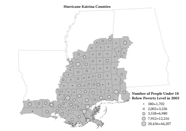 شکل 2-26: مثالی از نقشه نماد نسبتی: این مثال تعداد افراد زیر 18 سال که در استانهای منطقه ساحل خلیج زیر خط فقر زندگی میکنندو در سال 2003 نیازمند دریافت کمکیهای ناشی از طوفان کاترینا بودند را نشان میدهد. چنین نقشهای برای مقایسه تفاوتهای بین استانها جهت کاهش آسیب پذیری در برابر بلایا مفید است(تهیه نقشه توسط برایان توماسزوسکی).