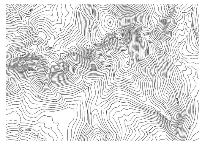 شکل 2. 27: مثالی از نقشه خطوط هم ارزش، در نقشه دارای خطوط فاصل، ارتفاع دارای مقادیر مشابه با استفاده از نمادهای خطی به هم متصل میشوند. در این نقشه، هر خط معرف دهنده تغییر 10 متری در ارتفاع است و تغییرات به ازائ هر 100 متر به وسیله برچسبهای ارتفاع نشان داده میشود. هر چه این خط ها بهم نزدیکتر باشند افزایش ارتفاع بیشتر است. از همین روش میتوان برای سطوح مستمر دیگر مانند دما یا بارش استفاده کرد. در مدیریت بلایا نقشه دارای خطوط فاصل میتواند دارای کاربردهای چندگانه است(مانند نمایش درجه شیبف مناطق آسیب پذیر در برابر سیلاب، برنامهریزی مسیر تخلیه)