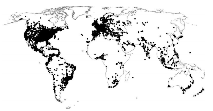 این نوع نقشهها توزیع مشاهدات در نقاط خاص را نشان میدهد. نقشههای تراکم نقطههای بر اساس این ایده شکل گرفته است که هر نقطه می تواند معرف یک یا چند نمونه در یک نقطه باشد و در نتیجه، تکنیکی مفید برای نشان دادن الگوها بر اساس مشاهدات نقطهای است(شکل 2-28).