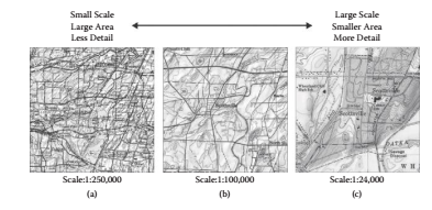 در حوزه مدیریت بلایا، به دودلیل داشتن مقیاس مهم است. 1-جزییات دادهها وابسته به مقیاس هستند0مقیاس تعیین کننده جزییات است). با نگاه به شکل 2-3 متوجه میشوید که مقیاس و به تبع آن جزییات هر نقشه برحسب اهداف متفاوت نقشه تغییر میکند. اگر بخواهیم از مثال مدیریت بلایا استفاده کنیم، نقشه دارای مقیاس 1: 24000 در سمت چپ شکل 2. 3 برای برنامهریزی درباره مسیرهای حمل کمکهای امدادی از طریق بزرگراه مناسب است. نقشه دارای مقیاس 1: 100000 در وسط این شکل برای برنامهریزی درباره محل استقرار تجهیزات امدادی در اطراف روستا مناسب است و نقشه دارای مقیاس 1: 24000 در سمت راست برای برنامهریزی درباره تخلیه اماکنی مانند خانه و مناطق روستا مناسب است. هرکدام از این کارکردها به مقیاس نقشهای که برای آن هدف و وظیفه استفاده میشود بستگی دارد. علاوه برآن، چنانچه در فصل 3 هم مشاهده خواهید کرد، در بحث درباره مفهوم فراداده(دادههایی که یک مجموعه داده را توصیف میکنند) بسیاری از مجموعه دادههای رقومی مورد استفاده در GIS بر اساس دیجیتال سازی دادههای حاصل از منابع غیررقومی است. بنابراین، دانستن مقیاسی که این دادههای رقومی شدهاند مهم است تا بدین طریق مطمئن شویم جزییات دادهها برای محقق شدن اهداف فرایند رقومی سازی داده کافی است.