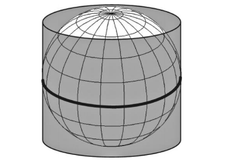 شکل 2-4 a: سطح تصویرسازی استوانهای که برای تصویرسازیهای استوانهای مورد استفاده قرار میگیرد. در این مورد، سطح تصویرسازی مماس یا در تماس با یک نقطه یا خط از کره زمین است.