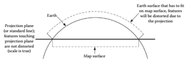 در تصویرسازی نقشه، یک منبع نور (فرضی) در مرکز مدل سه بعدی زمین قرار داده میشود. از این نقطه مرکز، نور بصورت اشعههایی که نشان دهنده طول وعرض جغرافیایی است بر روی یک سطح تصویرسازی دو بعدی که مبنای تصویرسازی نقشه است میتابد. همه تصویرسازیهای (نگاشت) نقشه برمبنای سه سطح تصویرسازی معمول است که در شکلهای 2-4 نشان داده شده است. در شکل 2-4 a -c خطوط مشکی پررنگ (در شکل 2-4 c نقطه مشکی بر بالای کره) خطوط استاندارد نامیده میشود. این خطوط درست در جایی قرار دارند که سطح تصویرسازی نقشه به مدل کره زمین متصل میشود. خطوط استاندارد تنها جایی در نقشه است که مقیاس واقعی را نشان میدهد(شکل 2-5).