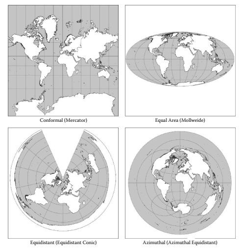 شکل 2-6: مثالهای تصویرسازی نقشه: در این شکل ها، طبقه کلی تصویرسازی همراه با نام تصویرسازی خاص نمایش داده شده است. تصویرسازی نقشه همدیسی (بالا سمت چپ) به وضوح نحوه حفظ شکل ها رانشان میدهد اما اندازه ومساحت تا حد زیادی دچار تحریف شده است(چنانچه در اندازه ومساحت گرینلند و قطب جنوب در قیاس با آفریقا قابل مشاهده است). تصویرسازیهای دارای مساحت برابر (بالا سمت راست) عوارض را با اندازه و مساحت درست و در شکل صحیح خود نشان میدهد. در اینجا آفریقا بطور صحیح برحسب اندازه و مساحت در مقایسه با گرینلند و قطب جنوب نشان داده میشود. تصویرسازی فاصله برابر (چپ پایین) بطور وضوح کاربرد سطح تصویرسازی مخروطی را نمایش میدهد. تصویرسازی آزیموتال(پایین سمت راست)بر روی عرض جغرافیایی 0 درجه و طول جغرافیایی 0 درجه واقع شده است. بنابراین هرگونه جهت محاسبه شده از این نقطه صحیح خواهد بود(تهیه نقشه توسط برایان توماسزوسکی)