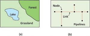 بر روی نقشه از سطح زمین، یا زمانی که نقشه کشیده، خم یا مخدوش میشود، نمایش داده میشوند (کوربت، 1979). سه رابطه توپولوژیکی که اغلب در دادههای مکانی رمزگذاری میشوند عبارتند از : مجاورت، اتصال و مهار. اگر دو ویژگی دارای مرز مشترک باشند، گفته میشود که مجاور هستند، مانند جنگل و علفزار در شکل 2-19 a . اگر یک ویژگی به طور کامل در ویژگی دیگری موجود باشد دارای محدودیت ارتباط هستند،ربه عنوان مثال دریاچه در مراتع در شکل 2-19 a قرار دارد. شکل 2.19b نمونه ای از اتصال را نشان میدهد که در آن پیوندهای یک شبکه خط لوله در گرهها به یکدیگر متصل میشوند. اتصال را میتوان برای دنبال کردن یک مسیر در امتداد یک شبکه (مانند شبکه جریان، شبکه فاضلاب یا شبکه جاده) استفاده کرد. اطلاعات توپولوژیکی را میتوان به طور صریح یا ضمنی در دادههای مکانی نشان داد.
