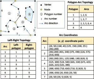 ساختار دادههای توپولوژیکی ذخیره دادهها را برای ویژگیهای منطقه کاهش میدهد زیرا مرزها یا قوسها بین چند ضلعیهای مجاور دوبار ذخیره نمیشوند، روابط توپولوژیکی صریح را حفظ میکنند و عملکرد تجزیه و تحلیل هم جواری را بهبود میبخشند. مانند ساختار دادههای غیر توپولوژیکی، آنها دادههای ویژگی را در جداول توصیفی و ویژگی ذخیره میکنند و دادههای ویژگی و هندسه را از طریق شناسههای ویژگی پیوند میدهند. ساختارهای داده توپولوژیکی که در بالا توضیح داده شد در پوشش ArcInfo یا به سادگی پوشش میشوند، یکی از چندین فرمت دادههای مکانی پشتیبانی شده توسط ArcGIS استفاده میشود (کادر 2-4). سایر ساختارهای داده توپولوژیکی معروف عبارتند از POLYVRT (Peucker and Chrisman 1975) ، DIME (Peucker and Chrisman 1975) و TIGER (Marx 1990).