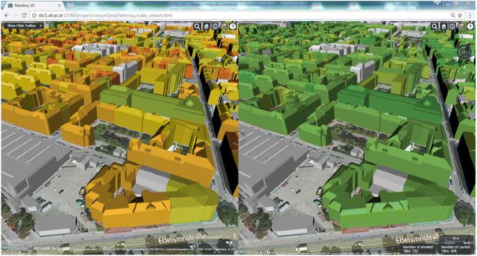 برای تجسم نتایج شبیه سازی شده، یک برنامه وب سه بعدی ایجاد می شود. بنابراین مدل شهر سه بعدی در قالب CityGML با نتایج شبیه سازی شده غنی شده و به قالب کاشی های سه بعدی تبدیل می شود. یک سرور NodeJS راه اندازی شده است که یک برنامه وب سه بعدی CesiumJS را اجرا می کند. Cesium یک کتابخانه جاوا اسکریپت است که برای تجسم مدل های شهرهای بزرگ و استایل دهی آنها بر اساس ویژگی های آنها در قالب کاشی های سه بعدی مناسب است [ 18 ]. در نتیجه، ساختمانها بر اساس اطلاعات ویژگیها (مثلاً تقاضای انرژی برای گرمایش و CO حاصله) سبکسازی میشوند. 2انتشارات). علاوه بر این، هر ساختمان را می توان برای بهبود عملکرد انرژی احتمالی از طریق نوسازی بازرسی کرد.