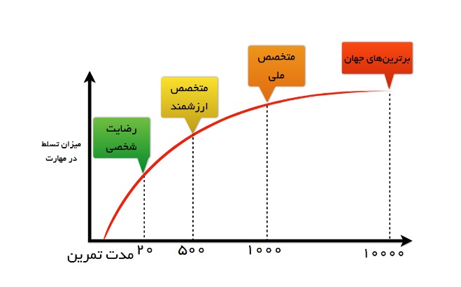 خب تا صرف ۱۰ هزار ساعت و حرفه ای شدن، مسیر طولانی است. اما طبق بررسی های انجام شده، همانند آنچه در تصویر زیر می بینید، شما تنها با صرف ۵۰۰ ساعت برای آموزش و یادگیری می توانید به یک متخصص در هر حوزه ای تبدیل شوید
