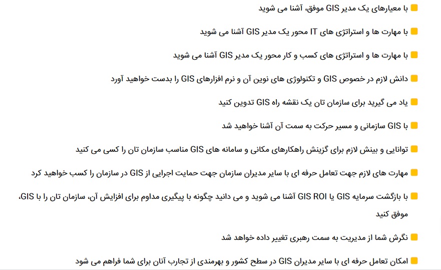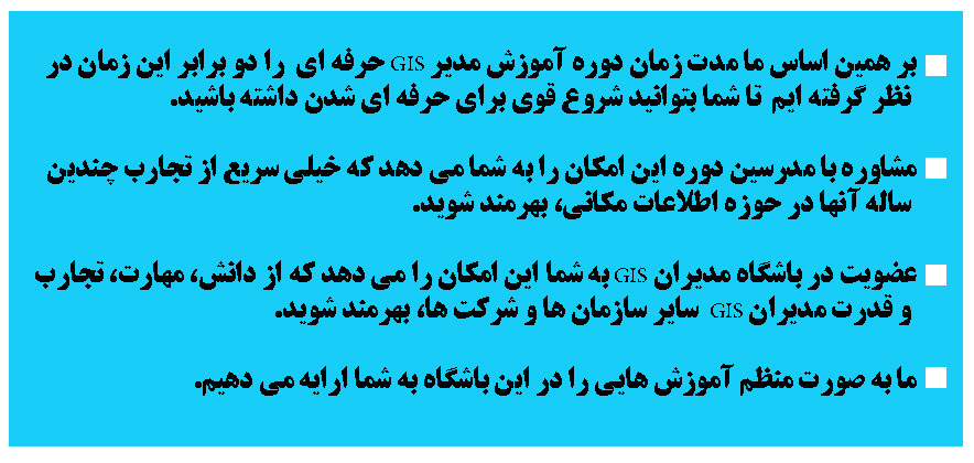 در پایان این دوره شما یک مدیر GIS توانمند خواهید بود که می تواند بازده GIS سازمانش را بالاتر ببرد.