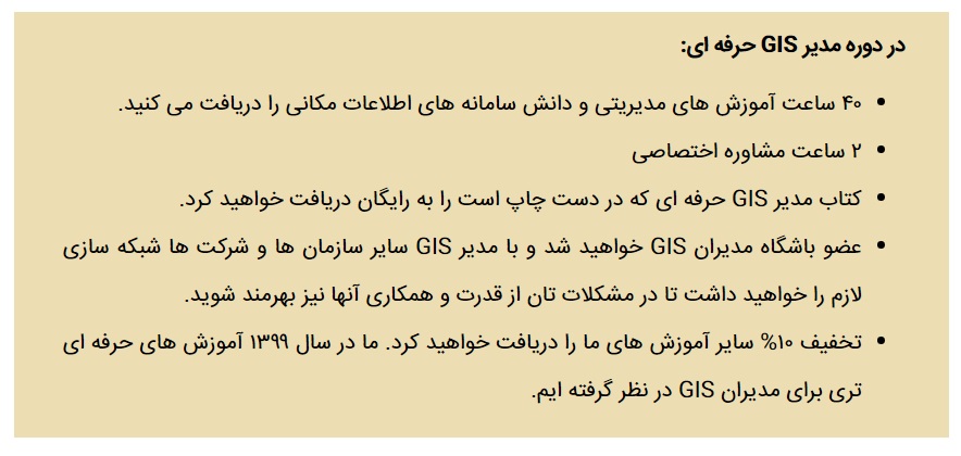 ما در سال ۱۳۹۹ یک برنامه ۵۰۰ ساعته برای مدیران GIS که می خواهند یک متخصص ارزشمند شوند و در مسیر حرفه ای شدن قرار بگیرند، تدارک دیده ایم.