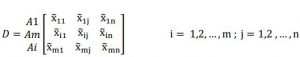 که در آن A1,A2,…,Amگزینههایی هستند که باید انتخاب شده یا اولویت بندي گردند. C1,C2,…,Cn شاخصها یا معیارهاي ارزیابی هستند. مطلوبیت گزینه Aiرا نسبت به معیار یا شاخص Cj توسط فرد خبره K ام نشان میدهد.به منظور یکپارچه نمودن امتیاز عملکرد فازي، Kفرد خبره از روش میانگینگیري حسابی طبق رابطه زیر استفاده میشود.