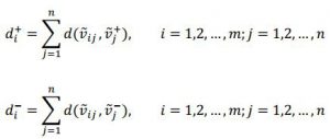 گام چهارم: محاسبه اندازه فاصله اي هر کدام از گزینه ها از مقادیر ایده آل فازي مثبت و منفی فاصله هر گزینه با راه حل ایده آل مثبت و راه حل ایده آل منفی فازي به صورت زیر محاسبه میشود.