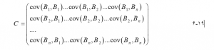 که در آن p و q به ترتیب تعداد ردیفها و ستونهای تصویر هستند، میانگین مقدار DN باند A، و میانگین مقدار DN باند B است. این اندازهگیری مقدار پیکسلهای این دو است. باندها از میانگین نسبت به یکدیگر متفاوت هستند. اگر بیش از دو باند در مجموعه داده تصویر وجود داشته باشد، بیش از یک اندازه گیری کوواریانس محاسبه میشود. در واقع، برای یک تصویر باند n، مقادیر کوواریانس متفاوت وجود خواهد داشت. مقادیر کوواریانس بین n باند در یک ماتریس n×n در قالب زیر قرار داده میشود: