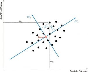 با توجه به مجموعه داده تصویر دو باند، توزیع دو بعدی مقادیر DN از دو باند را میتوان در یک نمودار پراکنده رسم کرد، همانطور که در تصویر شکل 6-21 نشان داده شده است. اگر همه نقاط روی خط PC1 قرار گیرند، دو باند کاملاً همبسته هستند. در بسیاری از موارد، نقاط در اطراف خط با PC1 به عنوان جهت غالب پراکندگی یا تغییرپذیری پراکنده میشوند. PC1 نشان دهنده جهتی است که در آن بیشترین واریانس وجود دارد و در آن دادهها بیشترین پخش را دارند. جهت اولین جزء اصلی در دادهها است. PC2 خط عمود بر PC1 است و از میانگین توزیع داده میگذرد. این خط جهت دومین جزء اصلی در دادهها را نشان میدهد. اگر تغییر در جهت PC2 شامل کسری کوچک از تنوع کل دادهها باشد، ممکن است بدون حذف اطلاعات زیاد نادیده گرفته شود. برای یافتن تصاویر جزء اصلی، PCA محورهای باند A–Band B را بر روی محورهای PC1-PC2 ترجمه و یا میچرخاند و مقدار DN جدید را برای پیکسل در ردیف i، ستون j بر حسب محورهای1 PC محاسبه میکند. و2 PC به شرح زیر محاسبه میشود :