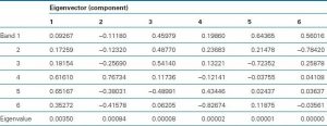 که در اینجا B1 ، B2 و ، Bn به باند 1 ، باند 2 و ارجاع داده میشود که در واقع واریانس a است. این ماتریس را ماتریس کوواریانس مینامند. نسبت به قطر اصلی متقارن است. ماتریس دارای n بردار ویژه است که عمود بر هم هستند. هر بردار ویژه دارای ارزش ویژه مرتبط است. بردارهای ویژه با استفاده از تکنیکهای تجزیه جبری خطی یافت میشوند ، که خارج از حوصله این کتاب است. اطلاعات بیشتر در مورد بردارهای ویژه و ارزشهای ویژه به طور کلی و نحوه استخراج آنها را میتوان در هر کتاب جبر خطی استاندارد یافت. به عنوان مثال جدول 6-4 ماتریس کوواریانس مشتق شده از wy00abd.tif را فهرست میکند، تصویر شش باندی ETM+ albedo Woori Yallock تصحیح شده رادیومتری است. جدول 6-5 بردارهای ویژه، مقادیر ویژه مرتبط و درصد واریانس صحنه محاسبه شده از ماتریس کوواریانس را فهرست میکند.