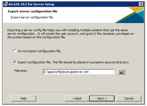 می‌توانید گزینه‌ی Export Configuration file را برای ایجاد فایل پیکربندی انتخاب کنید و فایلی شامل اطلاعات حساب ویندوزی ArcGIS for Server است.
