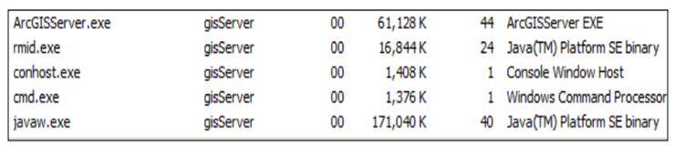 اگر نگاهی به Taskmanager بیاندازید (این پنجره را با فشردن همزمان کلیدهای Ctrl+Alt+Delete خواهید دید)، اطلاعاتی در مورد عملکرد سیستم‌تان خواهید دید. در سربرگ Details این پنجره، 5 فرآیند در حال پردازش از سرور ArcGISServer.exe خواهید دید. این 5 فرآیند در تصویر زیر آمده اند. دقت کنید که ممکن است این فرآیندها به ترتیب زیر برای شما ظاهر نشوند. اگر در سرستون User name کلیک کنید این پنج فرآیند به ترتیب زیر نمایش داده خواهند شد.