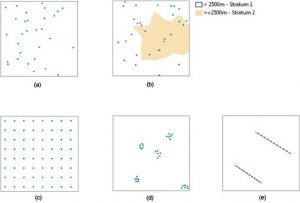 نمونه گیری ساده تصادفی شامل بدست آوردن تعداد مشخصی از نقاط نمونه در منطقه مورد مطالعه با انتخاب تصادفی مختصات x و y است. هر مکان در منطقه مورد مطالعه دارای شانس برابر برای انتخاب است. نقاط نمونه انتخاب شده ممکن است به طور ناهموار توزیع شوند (شکل 5-1 a) در نتیجه برخی از مناطق کمتر ارائه شده و برخی دیگر بیش از حد نشان داده شده اند. ناهمواری مکانی نتیجه طبیعی فرآیند تصادفی سازی است.
