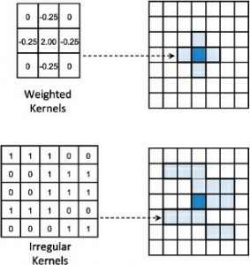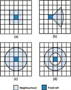 توابع کانونی یک مقدار جدید را برای هر سلول در شطرنج خروجی به عنوان تابعی از مقادیر، فواصل و/یا جهت سلولهای موجود در همسایگی آن در رستری ورودی محاسبه میکنند. سلولی که در حال حاضر پردازش میشود، سلول کانونی نامیده میشود. محله را میتوان در اشکال و اندازههای مختلف تعریف کرد. رایجترین شکلهای مورد استفاده عبارتند از: مستطیل (معمولاً با عرض و ارتفاع آن در سلولهای متمرکز در سلول کانونی، به عنوان مثال 3×3)، دایره (تعریف شده با شعاع آن در مرکز سلول کانونی)، گوه (تعریف شعاع امتدادی از سلول کانونی) سلول کانونی، زوایای شروع و پایان که در خلاف جهت عقربههای ساعت از شرق اندازهگیری میشوند) و حلقۀ حلقوی (تعریف شده توسط شعاعهای داخلی و خارجی در مرکز سلول کانونی) (شکل 4-20 را ببینید). محله همچنین میتواند به عنوان یک شکل نامنظم به نام کرنل تعریف شود که میتواند برای تعیین سلولهای محله در عملیات یا اعمال وزنهای مختلف به سلولهای محله استفاده شود ( شکل 4-21 را ببینید). توابع کانونی عمدتاً برای آمارهای کانونی یا همسایگی استفاده میشوند. مطالعه موردی 7 فصل 10 نمونه ای از نحوه استفاده از توابع کانونی در مدل سازی آلودگی هوا را ارائه میدهد. آنها همچنین برای فیلتر کردن در پردازش تصویر دیجیتال بسیار مفید هستند (به بخش 6-3 مراجعه کنید).