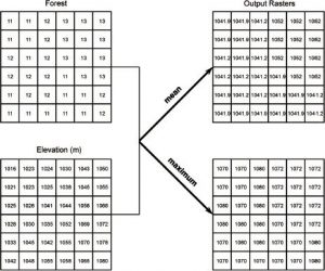 توابع منطقه ای مقدار جدید را برای هر سلول در رستری خروجی به صورت a محاسبه میکنند. تابع مقادیر موجود سلولهای متعلق به همان منطقه است. ناحیه گروهی از سلولها با ارزش یکسان است. این میتواند منطقه واحد یا چندین منطقه قطع شده که ارزش یکسانی دارند را تشکیل دهد. توابع منطقه ای آمار خلاصه تمام مقادیر سلول را در هر ناحیه محاسبه میکنند و آمار را در هر سلول منطقه در رستری خروجی مینویسند. آمار خلاصه شامل تمام موارد ذکر شده در جدول 4-5 است که مناطق معمولاً از لایه دیگری جدا از رستر مشخص میشوند که مقادیر سلول آنها باید به صورت آماری خلاصه شود. شکل 4-25 دو نمونه از آمار منطقه ای را نشان میدهد که میانگین و حداکثر ارتفاع را در هر نوع جنگل محاسبه میکند. برخی از بستههای GIS دارای توابع هندسی منطقه ای هستند که میتوان از آنها برای محاسبه مساحت، محیط، ضخامت و سایر خصوصیات هندسی برای هر منطقه در یک رستر استفاده کرد. کادر 4-13 نحوه دسترسی به توابع منطقه ای در ArcGIS را نشان میدهد.