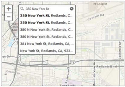 این ویجت برای اضافه کردن توابع geocoding به اپلیکیشن استفاده میشود. این ویجت یک textbox دارد و هنگامی که کاربر آدرس را درون این textbox تایپ میکند آدرسهای مرتبط با آدرس تایپی به صورت خودکار در جعبهی متنی ظاهر میشوند. این ویژگی اصطلاحاً Autocompletion نامیده میشود. برای استفاده از این ویژگی کافی است که ویژگی autoComplete را به مقدار true تنظیم کنید.