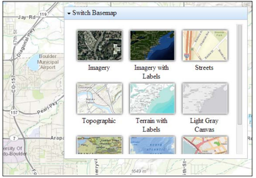 این ویجت مجموعهای از نقشههای مبنای موجود در سایت ArcGIS.com را نشان میدهد. هم چنین این ویجت نقشههای مشخص شدهی کاربر را نشان میدهد. زمانی که یک نقشهی مبنا از مجموعه انتخاب میشود؛ نقشه مبنای فعلی در حال نمایش، حذف میشود و نقشه مبنای انتخابی، نمایش داده میشود.