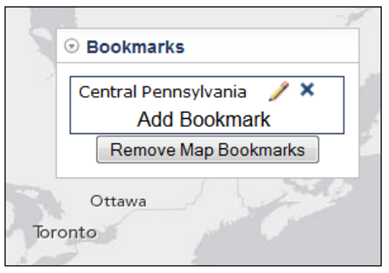 تصویر زیر اضافه کردن محدودهی ایالت پنسیلوانیای مرکزی را به نقشه نشان میدهد که با کلیک بر روی Add Bookmark این محدوده به نقشه اعمال میشود و نقشه روی این ایالت زوم میشود.